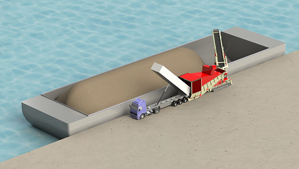 - Виключення подвійної перевалки матеріалу завдяки розвантаженню самоскидів безпосередньо в приймальний бункер мобільного живильника, що виключає необхідність розвантаження спочатку на склад чи причал