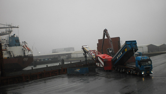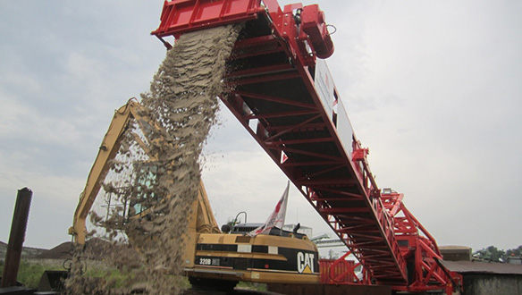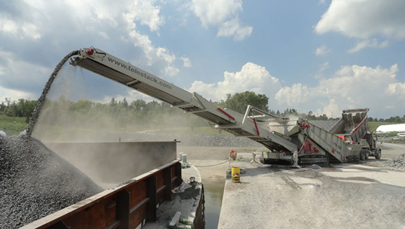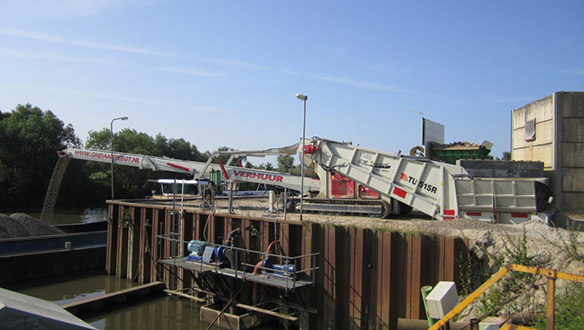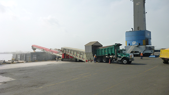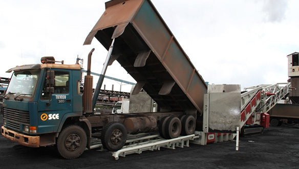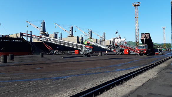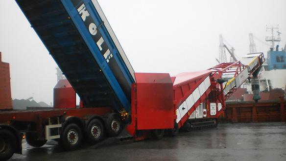 - Виключення подвійної перевалки матеріалу завдяки розвантаженню самоскидів безпосередньо в приймальний бункер мобільного живильника, що виключає необхідність розвантаження спочатку на склад чи причал